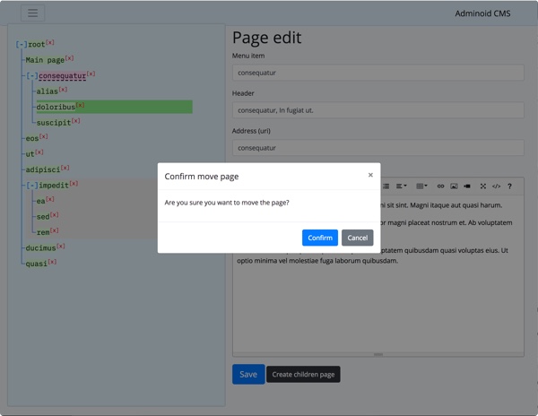 Created on the inspiration of a MODX CMS with which I once worked for a long time. Implemented on laravel and vue.js. It's a simple, but extensible seo-friendly content management system, tree-based view of pages and control through tree view, where you can simply drag the page nodes to move them.