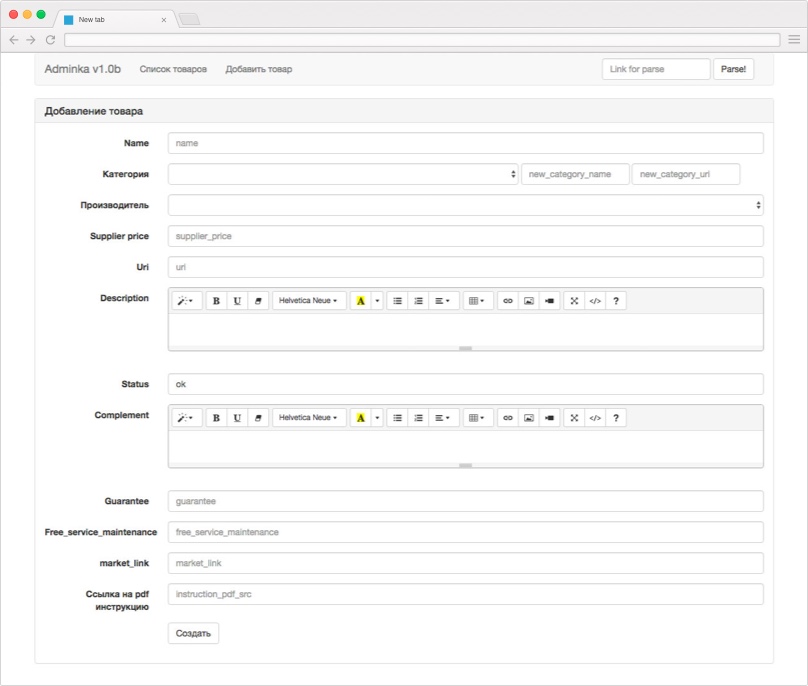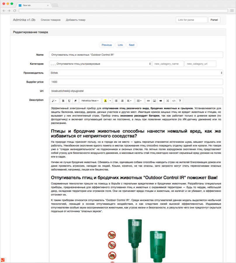 Products control panel for e-shop "ikmed.ru"